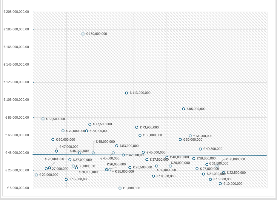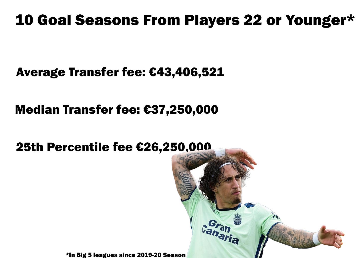Of course there are outliers, like Kylian Mbappé’s record transfer fee to PSG and Eren Dinkçi’s lowly €5,000,000 price tag from a triggered release clause following his breakout season. But the blue line on the graph is the average price, around €43,000,000.