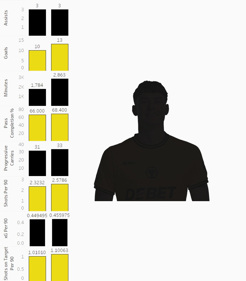 Which brings us to the core question behind this post, how much should we realistically be expecting for the transfer of the once beleaguered wunderkind Fabio Silva? Purchased from FC Porto for a whopping €40,000,000 in 2020, at only 18, the striker had struggled to make a consistent impact, and was widely viewed as a massive sunk cost for the club’s books. Most of us have been resigned to taking any slight recoup of his purchase price that could be reinvested into the lineup. Well at least that was the thinking until he has managed to turn things around this season at Las Palmas. Following this train of thought, I found the similarities to JSL’s last season at Celta Vigo so striking because the terms of his loan to buy obligation are rumored to be around €30,000,000, a fair number we will happily pay for a player tied for 11th on the Premier League scorer’s table and Wolves’ first real talisman since the pre-injury Raúl Jiménez.